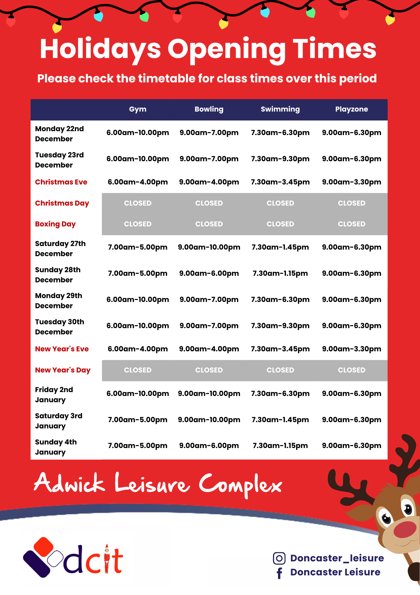 Please note this is the centre's opening hours. Swimming, Bowling, Playzone and Fitness Village opening hours are subject to session times.