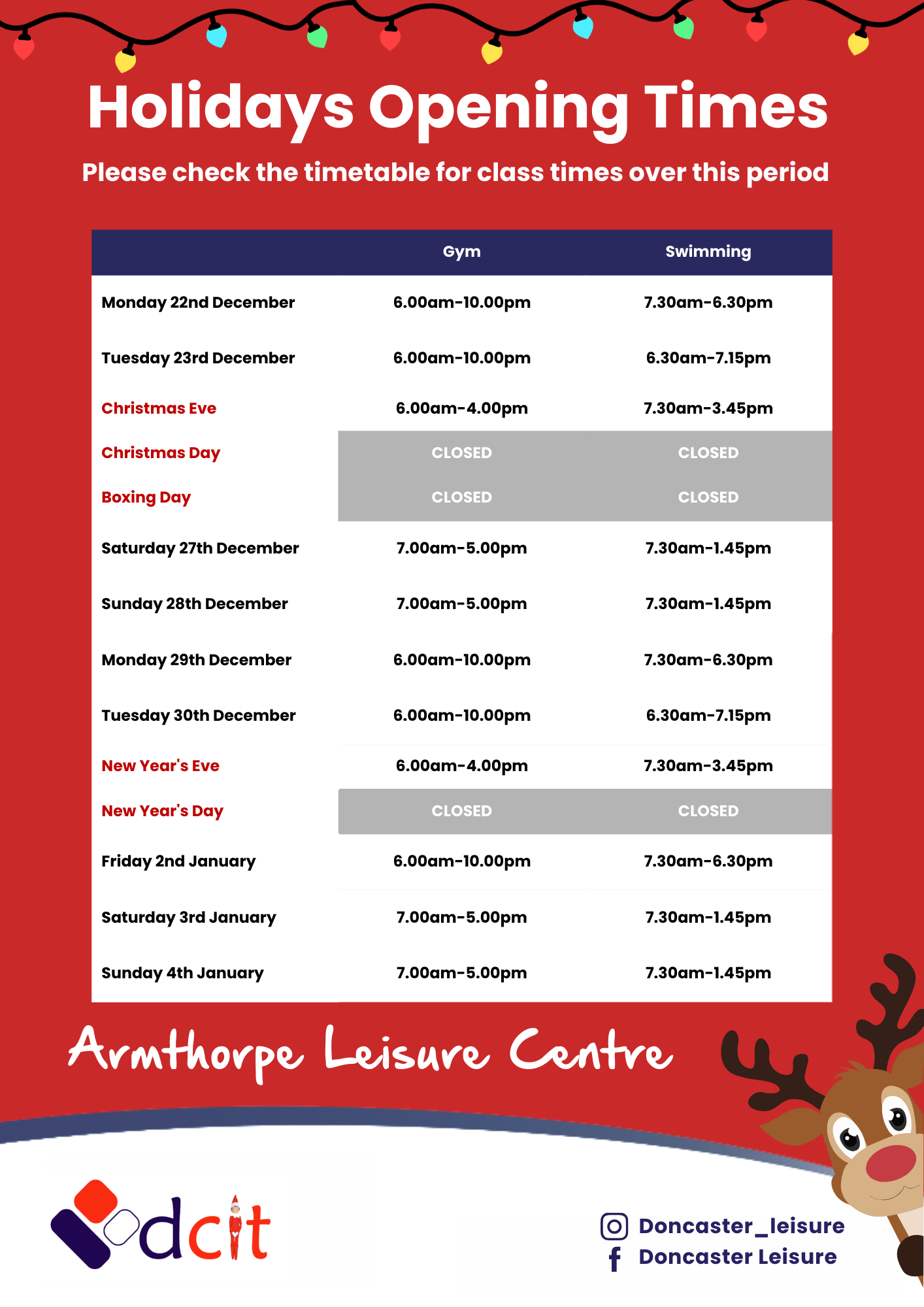 Please note this is the centre's opening hours. Swimming and Gym opening hours are subject to session times.
