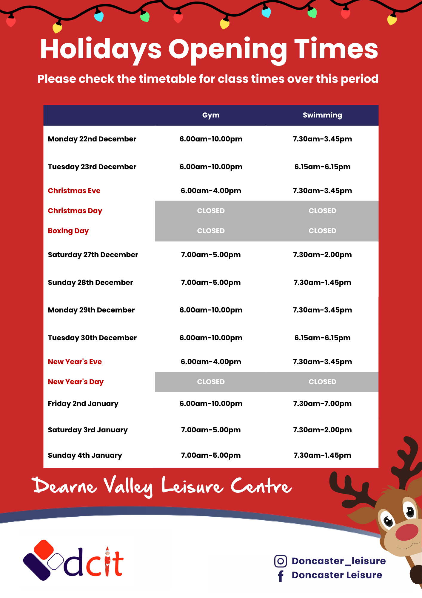 Please note this is the centre's opening hours. Individual sessions and activity times are subject to session times so please check the timetable for details.